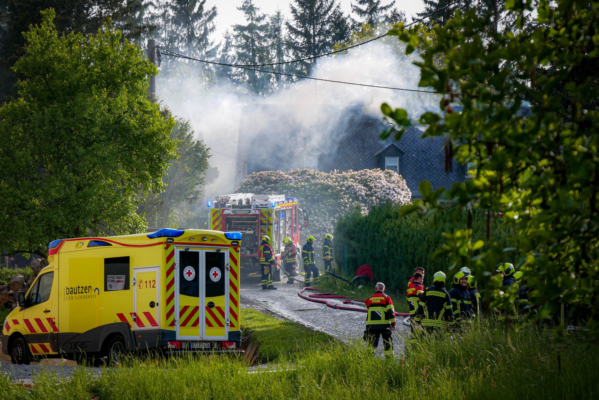 Am Mittwoch Nachmittag, dem 14.05.2025 gegen 17:00 Uhr wurde die FF Ohorn zusammen mit umliegenden Wehren nach Ohorn an den Hahneberg gerufen worden. Es sollte ein Einfamilienhaus brennen. Schon auf Anfahrt bestätigte sich die Meldung, denn es war dichter Rauch zu sehen. Das HLF20 und das TLF der FF Pulsnitz sowie das HLF10 der FF Ohorn waren nach dem Rettungsdienst die ersten, die eingetroffen sind. Die Feuerwehr Ohorn leitete daraufhin direkt den Löschangriff von außen ein. Die FF Pulsnitz setzte zeitnah 2 Trupps unter schwerem Atemschutz für den Innenangriff ein. Mehr Infos in dem Einsatzberichten der alarmierten Feuerwehren. Der Sachschaden beläuft sich auf ca. 50.000€.