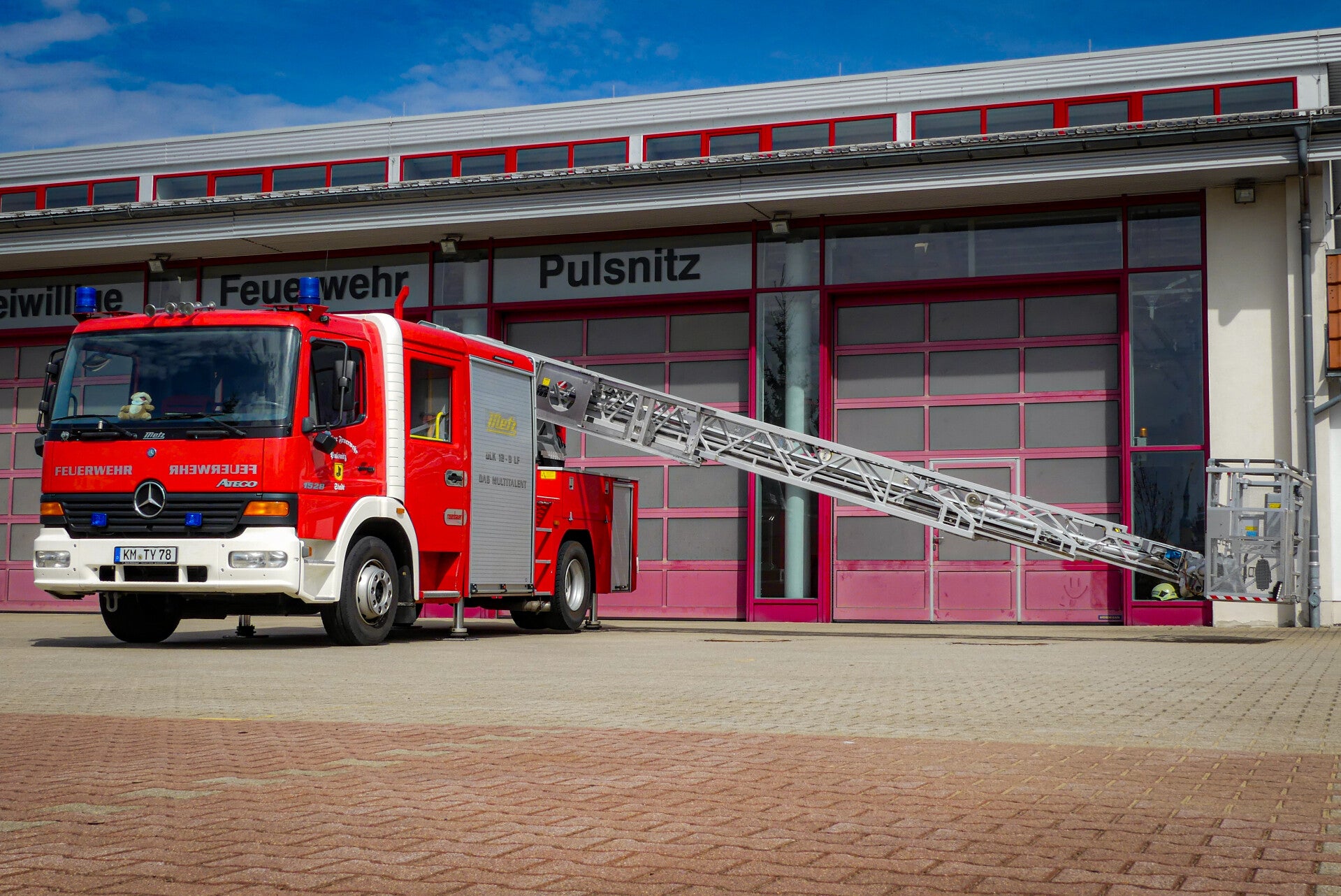 Drehleiter mit Korb und Löschfahrzeug (außer Dienst) der Freiwilligen Feuerwehr Pulsnitz